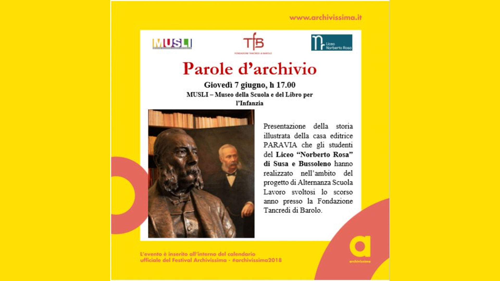 Per il programma completo del Festival – che comprende tavoli di lavoro, conferenze a tema, seminari, mostre, proiezioni e tanto altro – consultare il sito www.archivissima.it