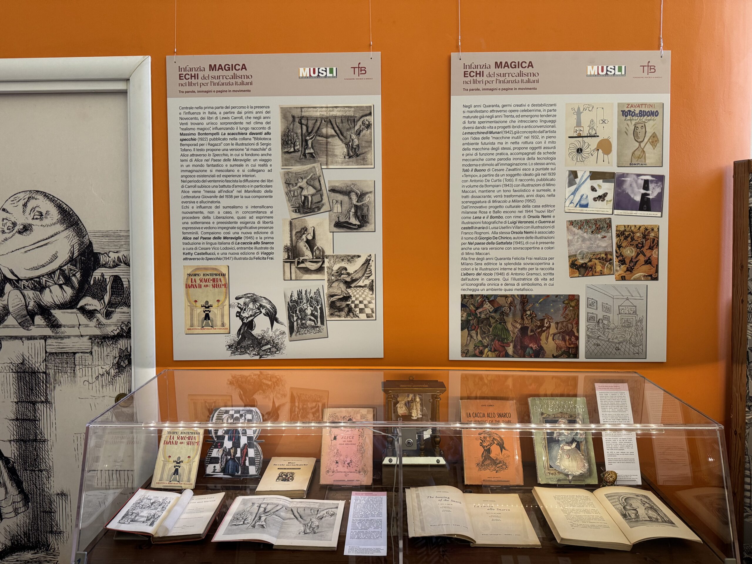La mostra bibliografica, allestita nel Percorso Libro del MUSLI, propone una rassegna alla ricerca di echi, presenze e influenze del surrealismo nella produzione editoriale per l’infanzia a partire dalla ricezione in Italia delle opere di Lewis Carroll, soffermandosi in particolare sugli anni Quaranta e Cinquanta del Novecento. In quegli anni, infatti, dopo la censura del fascismo, quasi a dar voce a un bisogno profondo e preesistente di libertà, si intensificano i legami tra il mondo dell’arte e i libri per l’infanzia, con una confluenza di generi diversi: la dimensione fiabesca, onirica e il nonsense, territori in cui, risalendo all’infanzia, possono emergere le pulsioni primigenie.
